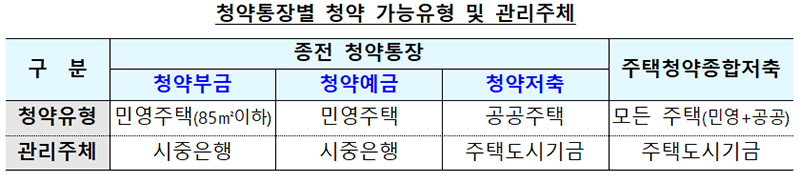 통장 유형에 따라 민영·공공주택 하나만 청약이 가능했던 종전의 청약예금·부금, 청약저축통장 등 입주자저축을 모든 주택 유형에 청약할 수 있는 주택 청약종합저축통장으로 전환을 허용한다.